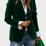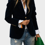Αυτό το προσεκτικά ραμμένο μπλέιζερ διαθέτει κλείσιμο με ένα κουμπί που δημιουργεί μια καθαρή και δομημένη σιλουέτα. Διακριτικά χρυσά κουμπιά σε τόνο του υφάσματος κοσμούν τους καρπούς για μια εκλεπτυσμένη λεπτομέρεια, ενώ οι αιχμηρές πέτες και οι ελαφρώς επενδεδυμένοι ώμοι προσφέρουν μια κλασική πινελιά κομψότητας. Η εφαρμοστή του γραμμή συνδυάζεται εύκολα τόσο με ένα χαλαρό τζιν όσο και με πιο επίσημα κομμάτια, για ένα στυλ ταυτόχρονα κομψό και ευέλικτο.