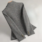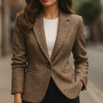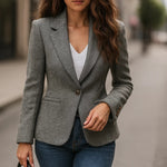 Κατασκευασμένο από premium μαλλί σε ύφανση ψαροκόκαλο, αυτό το μπλέιζερ προσφέρει δομή με εύκολη ροή για μια φυσικά κολακευτική εφαρμογή. Ένα ραμμένο κλείσιμο μονής σειράς και λειτουργικές τσέπες προσθέτουν κομψές λεπτομέρειες, ενώ οι μανσέτες με κουμπιά ολοκληρώνουν την εμφάνιση. Σχεδιασμένο ως ένα ευέλικτο κομμάτι, συνδυάζεται εξίσου εύκολα με κομμένα παντελόνια όσο και με κομψά, chic τζιν.
