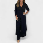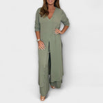 Ανανεώστε την γκαρνταρόμπα σας με αυτό το στυλάτο σετ τριών τεμαχίων για γυναίκες. Αυτό το σετ που αποτελείται από μια μακριά μπλούζα και παντελόνι που ταιριάζει, συνδυάζει μια χαλαρή εμφάνιση με κομψότητα, ιδανικό τόσο για casual εξόδους όσο και για εκλεπτυσμένα γεγονότα.