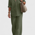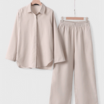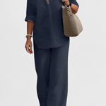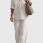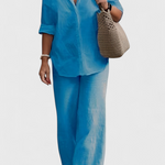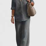 Το σετ Skye συνδυάζει τη δομημένη απλότητα με την καθημερινή άνεση. Κατασκευασμένο από ένα ελαφρύ μείγμα βαμβακιού και λινό, περιλαμβάνει μια μπλούζα με κουμπιά σε χαλαρή γραμμή και παντελόνια με ελαστική μέση που προσαρμόζονται στο σώμα με απαλότητα. Μια λειτουργική πρόταση που ρέει ανάμεσα στο casual και το κομψό χωρίς προσπάθεια.