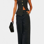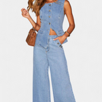 Το σετ Ludovica ανα redefine το denim με μια κομψή πινελιά. Το εφαρμοστό γιλέκο χωρίς μανίκια αγκαλιάζει τη σιλουέτα με κομψότητα χάρη στην κλείσιμο με κουμπιά, ενώ τα τζιν με φαρδύ μπατζάκι και ψηλή μέση προσφέρουν άνεση και μια χαλαρή, μοντέρνα εμφάνιση. Ιδανικό για να συνδυάσει τον αστικό στυλ με τη σιγουριά της θηλυκότητας.