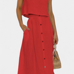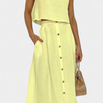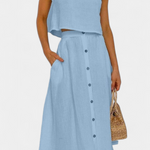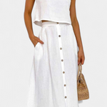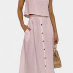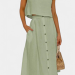 Ένα ευέλικτο σύνολο εμπνευσμένο από τον μινιμαλισμό που αποπνέει φρεσκάδα, άνεση και casual στυλ. Η ελαφριά υφή από βαμβάκι, ο ρευστός σχεδιασμός και τα διακοσμητικά κουμπιά το καθιστούν την τέλεια επιλογή για χαλαρές ημέρες ή αστικές αποδράσεις με φυσική γοητεία.