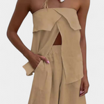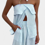 Ένα ισχυρό look με καλοκαιρινή διάθεση. Η Oriana συνδυάζει ένα τοπ τύπου bandeau με μια μακριά φούστα με πλαϊνό άνοιγμα, δημιουργώντας μια κομψή και σίγουρη σιλουέτα. Ο μινιμαλιστικός σχεδιασμός αναδεικνύει τη σιλουέτα με διακριτικότητα, ιδανικό για όσους θέλουν να ξεχωρίζουν χωρίς κόπο. Μια ευέλικτη επιλογή που λειτουργεί τόσο για ένα δείπνο δίπλα στη θάλασσα όσο και για ένα απόγευμα στην πόλη.