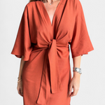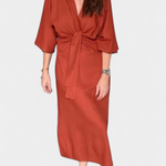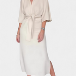 Απλότητα που μαγνητίζει με μια σιλουέτα σχεδιασμένη για να ξεχωρίζει φυσικά. Το φόρεμα Ainhoa συνδυάζει ένα βαθύ ντεκολτέ σε σχήμα V με μανίκια τύπου κιμονό και έναν κεντρικό κόμπο που περιβάλλει τη μέση με απαλότητα. Ο δομημένος του ύφασμα και ο λειτουργικός του σχεδιασμός το καθιστούν έναν απαραίτητο, ευέλικτο και κομψό επιλογή.