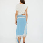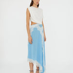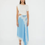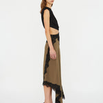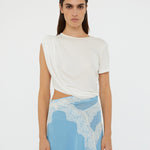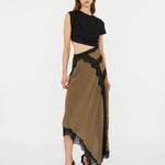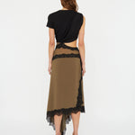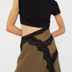 Το φόρεμα Verve Twisted Tee Midi επαναστατεί την σύγχρονη κομψότητα με την καλλιτεχνική του αλληλεπίδραση αποδόμησης και σχεδίου. Ένα στριφτό μπλουζάκι, προσεκτικά αποσπασμένο και επανασυνδεδεμένο σε μια χαλαρή maxi φούστα, δημιουργεί μια δυναμική σιλουέτα, ενώ οι πάνελ με δαντέλα διασχίζουν το σώμα σχηματίζοντας σκόπιμες ανοίξεις, οδηγώντας σε μια καταρρακτώδη, ασύμμετρη τελείωμα. Κατασκευασμένο από αντίθετα υφάσματα—λεπτή ελαστική βισκόζη και σατέν—αυτό το midi φόρεμα συνδυάζει τη δομή με τη ροή, κάνοντάς το ένα εντυπωσιακό κομμάτι για βραδινές εκδηλώσεις ή μοντέρνες περιστάσεις.